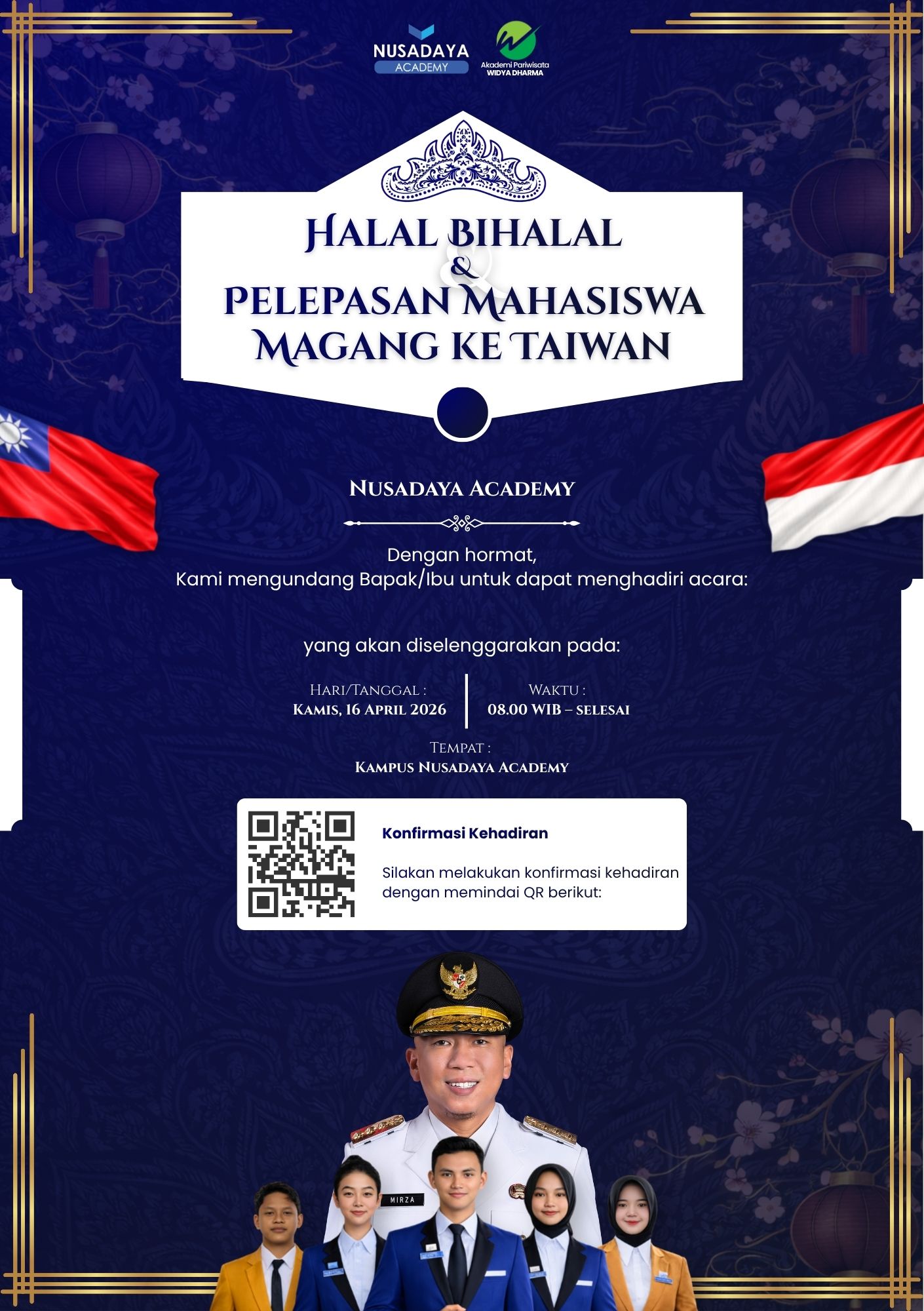 Dengan hormat, kami mengundang Bapak/Ibu untuk dapat menghadiri acara Halal Bihalal dan pelepasan simbolis mahasiswa magang ke Taiwan dalam suasana hangat, formal, dan penuh makna.